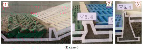 In the experiment, the overtopped water is collected by the water collecting device, and then the volume and the unit discharge of the overtopped water are calculated. Table 2 shows the calculation results of the average unit discharge of the overtopped water under the various design conditions. In order to provide the values for the Meizhou Bay breakwater, referring to the unit discharge of the overtopped water in the experiment, the unit discharge of the prototype is also calculated according to the scale scaling and similarity criteria. In the cases of 1 and 2, the still water depth is at the second step slope according to the design low water level. Under the regular and irregular waves, the wave heights are always lower than the breakwater height, so there is no overtopping in these two cases. In the cases of 3 and 4, when the multi-year mean high water level is at the first step slope, the unit charges of the overtopped water under the prototype breakwater are 29.4 and 23.1 (m3/(m·s) × 10−3) under the regular and irregular waves, respectively, which means that the overtopped water under the regular wave is larger than that under the irregular wave when the wave height of the regular wave equals the significant wave height of the irregular wave. In the cases of 5 and 6, the design high water level is at the wave dissipation ridge, the unit charges of the overtopped water under the prototype breakwater are 77.9 and 51.5 (m3/(m·s) × 10−3) under the regular and irregular waves, respectively. In these two cases, the overtopped water under the regular wave is larger than that under the irregular wave because the once-in-a-hundred-years wave height of the regular wave is higher than the significant height of the irregular wave. According to the results, it is found that under the same wave—with the increase of the still water depth—the overtopped water increases, resulting in more disaster. Under the same still water depth and the significant wave height, the overtopped water under the regular wave is more than that under the irregular wave, which means that when studying the interaction between the wave and the breakwater, regular waves cannot reflect the actual waves accurately. Besides, with the increase of the wave height, the overtopped water also increases. It can be inferred that, when the storm surge occurs, damage to the breakwater under the high tide level is greater than that under the low tide level.