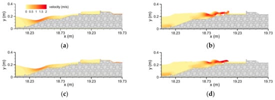 Velocity distribution during wave run-up and wave breaking with and without the fence plate; (a,b) without fence plate; (c,d) with fence plate.