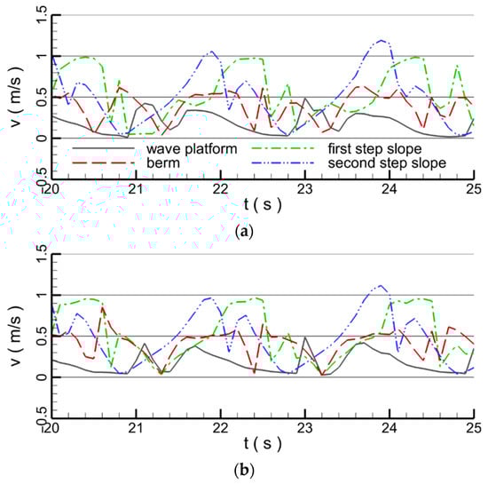 Figure 10 shows the velocity near the breakwater at different locations with and without fence plate, where when the gap ratio is 0%, the breakwater is without the fence plate. Although the wave velocity depends on the location, it is still periodic. The maximum velocity on the second step slope is the largest because of wave run-up. With the propagation of the wave, the velocity decreases and the velocity on the wave platform is minimal, because the effect of the berm on the wave energy dissipation results in the velocity plummeting, and then the wave energy is further dissipated by the first step slope. When the breakwater is without the fence plate, the maximum velocity on the second step slope is about 1.2 m/s which is higher than 1.05 m/s with the effect of the fence plate. Besides, the maximum velocity at different locations of the breakwater without the fence plate is higher than that with the fence plate, which means that the effect of elements on the slopes and platforms plays a certain role in wave propagation.