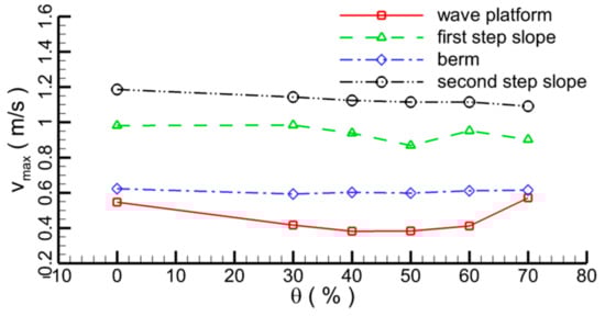 Figure 11 shows the maximum velocity at different locations for different gap ratios. With the increase of the gap ratio, the velocity on the second step slope decreases linearly from 1.2 m/s to 1.1 m/s. However, when the gap ratio is 50%, the maximum velocity on the first step slope, the berm, and the second step slope is lower than that under other gap ratios. In general, when waves propagate onto the second step slope, the individual fence plate on this slope is involved in energy dissipation, and as waves continue to propagate, the number of breakwater accessory structures involved in energy dissipation increases. With wave run-up, the kinetic energy of the wave decreases and the gravity potential energy increases and the stepped structure has strong energy dissipation ability. Besides, it is found that when the gap ratio is 50%, the maximum velocity on the breakwater is the minimum, indicating that this gap ratio is beneficial to the attenuation of velocity.