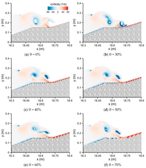 Figure 12 shows the vorticity distribution on the berm and adjacent slopes for different gap ratios, where the blue layer and the red layer present the clockwise vorticity and the counterclockwise vorticity, respectively. When the wave runs up on the second step slope and the berm, the vortex of the water body rotates clockwise. On the first step slope, the water body left by the last wave slips down and the vortex rotates counterclockwise in the gap. When the fence plate is without the gap, there is almost no vorticity distribution on the smooth surface of the slope. With the increase of the gap, the obvious vorticity distributes along the surface from Figure 12b–f. This suggests that the existence of the fence plate has a significant influence on the vorticity distribution. As the gap ratio of the fence plate increases from Figure 12b–d, the vorticity distribution along the fence plate gradually widens. As the gap ratio continues to increase (Figure 12e,f), the vorticity in the gap of the fence plate begins to shed. When the gap is small, the vortex in the cavity attaches before they are completely shed, while when the gap is large, the vortex in the cavity can fall off completely. This indicates that the fence plate with a larger gap ratio is beneficial to the development of vortex on the fence surface.