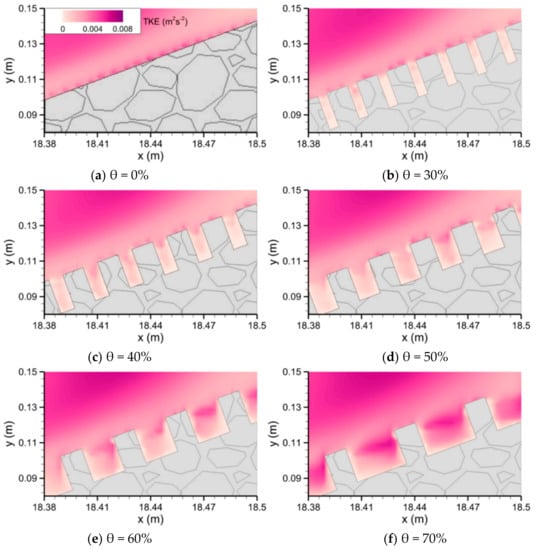 In order to analyze in detail and intuitively the effect of the fence plate on the wave energy dissipation, the local turbulent kinetic energy distribution of the fence plate is demonstrated. Figure 13 shows the turbulent kinetic energy distribution near the cavities of the fence plate on the second step slope for different gap ratios. It can be seen that the turbulent kinetic energy is distributed in the serrated edges and cavities of the fence plate. With the increase of the gap ratio, the distribution range of turbulent kinetic energy increases, and the value of turbulent kinetic energy in the cavity increases. The greater the turbulence kinetic energy value is, the higher the turbulence kinetic energy dissipation is, so the greater the gap ratio of the fence plate is, the greater the energy dissipation capacity of the fence plate is. However, considering the structural stability and strength of the fence plate, the gap rate should not be too large in practical engineering application. Moreover, a large gap ratio leads to the reduction of the cavities, which reduces the effect of the fence plate. In general, the analysis of the distribution of turbulent kinetic energy on the second step slope also shows that a larger gap ratio is more conducive to energy dissipation.