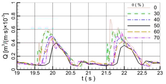 Figure 14 shows the temporal evolution of the wave overtopping volume under different gap ratios. When the gap ratio (θ) is 0, the maximum overtopping volume is about 0.7 m3/(m·s) × 10−3, which is larger than those under other cases. With the increase of the gap ratio from 30% to 50%, the volume decreases, indicating that the fence plate can reduce the wave overtopping volume. Then, when the gap ratio continues to increase, the volume increases, which indicates that the energy dissipation capacity is the strongest when the gap ratio is 50% under the synergistic condition of fence plate and stepped structure. Besides, considering the stability of the fence structure and the breakwater, the gap ratio should not be too large or too small. A small gap ratio will result in too much complexity in the production process and poor wave-reducing ability. If the gap ratio is too large, the fence plate will be too fragile and easily damaged. Therefore, it is suggested that the gap ratio of 50% in the fence plate is reasonable.