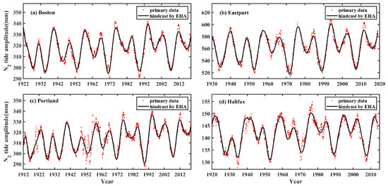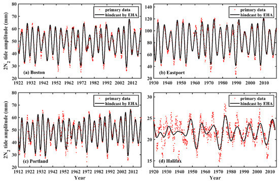 All the most suitable numbers for IPs in analyzing 8.85-year cycles of N2 tide and 4.42-year cycles of 2N2 tide at 4 stations are listed in Table 6. Meanwhile, the comparisons between the observational and hindcast amplitudes by the EHA methods of the N2 and 2N2 tide at four stations are exhibited in Figure 2 and Figure 3, respectively. These hindcasts are obtained with the best-fit numbers of IPs listed in Table 6. Their amplitudes agree well with the observations except for extreme values, which may be caused by weather factors and tidal resonance. The errors between hindcasts and observations are small and reasonable. However, hindcasts at Halifax (Figure 3d) show a large difference with observations. This phenomenon implies that the number of IP3 = 1 in analyzing the 2N2 tide is inapplicable at Halifax. In other words, the amplitude of the 8.85-year cycle is not a constant and its variation affects the water level remarkably at Halifax. Taking the numbers of IP3 for the 8.85-year cycle and IP4 for the 4.42-year cycle to be equal to 8 and 35, respectively, the results would improve remarkably (Figure 4 vs. Figure 3d). It is noted that the long-term trend shown in Figure 5 is not affected by the number of IPs. The numbers of IP3 and IP4 listed in Table 6 at Halifax are applied in Figure 6b and Figure 7b to keep the consistency of the method.