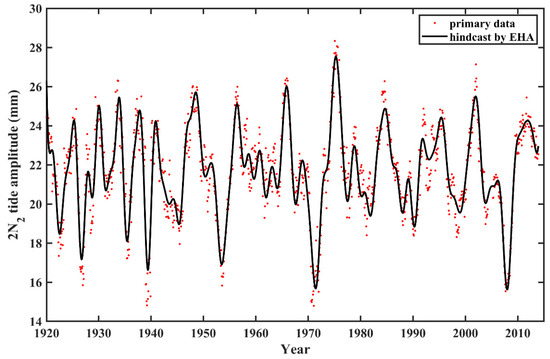 The primary amplitudes (red dots) and the hindcast amplitudes by the EHA method (black lines) of 2N2 tide at Halifax by taking IP3 = 8 and IP4 = 35.
