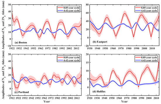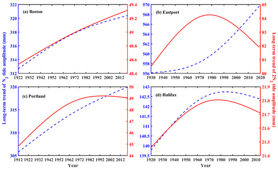 As Ray and Foster [22] pointed out, the nuisance flooding, which is only triggered by high spring tides, has become more frequent since 2011 at Boston. Consequently, much attention should be paid to secular variation in water levels, as well as the long-term trend of tidal components. Figure 5 displays the long-term nonlinear trends of the N2 (blue dash line) and 2N2 (red solid line) tidal amplitudes at Boston, Eastport, Portland, and Halifax, respectively. As indicated in Section 3.1, the number of IPs is set equal to 0 and the parameter is equal to 3 to obtain the long-term nonlinear trend of N2 and 2N2 tidal amplitudes by the S_TIDE.