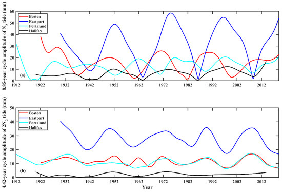 The 8.85-year cycle amplitudes of N2 tide (a) and 4.42-year cycle amplitudes of 2N2 tide (b) at Boston, Eastport, Portland, and Halifax.