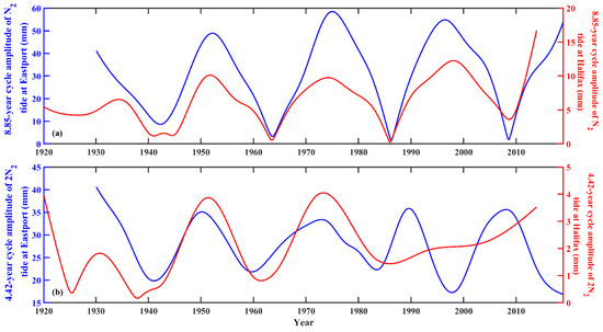 The 8.85-year cycle amplitudes of N2 tide (a) and 4.42-year cycle amplitudes of 2N2 tide (b) at Eastport (blue lines) and Halifax (red lines).