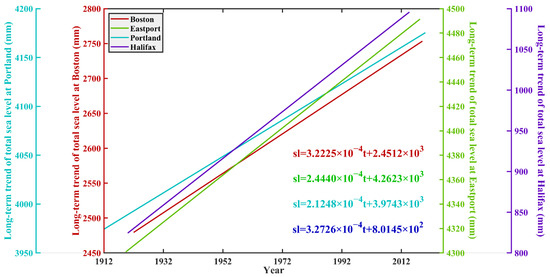 The long-term linear trend of total sea levels at four stations: Boston (red line), Eastport (green line), Portland (cyan line), and Halifax (purple line). Equations in the figure represent the linear trend fitting for four tide gauges. sl is the total sea level (mm), t is the time (h).