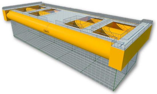 The main configuration of the floating breakwater was optimized based on the cylindrical floating breakwater configuration in a previous study by Professor Ji [10,11,12,13,14], and the three-cylinder floating breakwater was selected as the final configuration and used as the prototype of the experimental model. The design scheme, with a total length of 40 m, width of 15.4 m, and depth of 3.4 m is shown in Figure 1, Figure 2, Figure 3 and Figure 4. The main body is made of three 3 (diameter) × 40 m (length) cylinders, connected by some square box structures, and the width of the square box structures has three specifications: 2, 2.5 and 10 m. The design draft of the configuration is 1.7 m, and the displacement of a single module is 665.6 t.