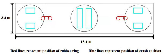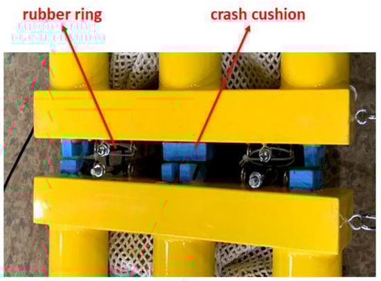 The floating breakwater system was composed of eight three-cylinder modules. The elastic connectors between every two modules were combined with crash cushions and rubber rings, as shown in Figure 15. Crash cushions were mainly used to withstand the pressure between modules, and the rubber rings were mainly used to withstand the tension between modules.