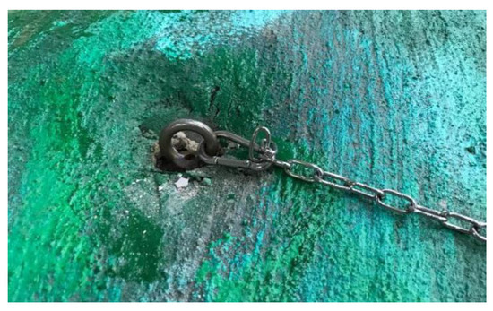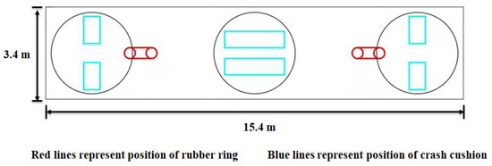 The connection structure between floating breakwaters was an elastic connection mode that combined rubber rings and crash cushions. The layout scheme of the connection structure of adjacent floating breakwater modules is shown in Figure 3 and Figure 4. Six crash cushions were arranged at each end of the floating breakwater, including four small crash cushions and two large crash cushions. The small crash cushions were arranged at the center of the two outer cylinders, and the actual size was 1000 × 600 mm. The large crash cushions were arranged at the center of the middle cylinders, and the actual size was 2200 × 600 mm. The rubber ring was connected to the structure by the lifting lug arranged at the end of the structure, and the adjacent floating breakwater modules were connected by two rubber rings. The actual size of the rubber ring was 1200 (outside diameter), 400 (inside diameter), and 400 mm (cross-sectional diameter).