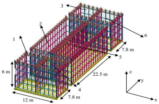 The underwater wave attenuation mesh cage was divided into six sub-cages, as shown in Figure 5. Mesh cages 1, 3, 4, and 6 have the same dimensions, with lengths of 6, 7.8, and 6 m along the X, Y, and Z directions, respectively. The sizes of mesh cages 2 and 5 are the same; the lengths along X, Y, and Z are 6, 22.5, and 6 m, respectively, and the density of the mesh cage is 0.3 kg/m3.