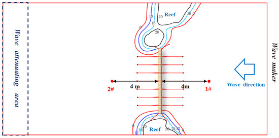 In order to truly reflect the wave attenuating performance of floating breakwaters under the influence of reef topography, regular wave experiments under different wave heights and periods were conducted. The wave attenuating performance, motion responses, and mooring forces of the floating breakwaters were measured. The wave direction of the regular wave experiments was a regular beam wave (β = 90°). Each wave height contained a combination of different wave periods, as shown in Table 5. The wave direction is shown in Figure 6, and the overall layout of the experiment is shown in Figure 21.