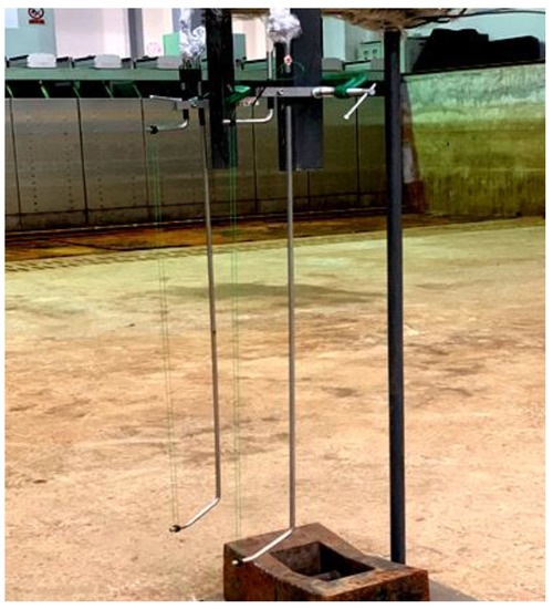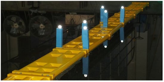 To measure and calculate the wave attenuating performance of the floating breakwaters, a wave gauge (WG) and acquisition system were used to record the time-history curves of the wave in front and back of the floating breakwaters. The layout positions are shown in Figure 6, 1# is located 4 m in front of the breakwater and 2# is located 4 m behind the breakwater. The transmission coefficients were calculated by data processing, which provided an important basis for evaluating the effect of wave attenuation of floating breakwaters. As the transmission coefficients were separated by the two-point method [28], two WGs, shown in Figure 7, were arranged at each layout position during the experiment, the two WGs at the 1# layout position are recorded as WG1 and WG2, the two WGs at 2# layout position are recorded as WG3 and WG4. Load cells were used to measure the mooring forces at the front and back of the floating breakwater, and the layout is shown in Figure 8. The load cell used during the experiment is shown in Figure 9. Data were collected through the collector and amplifier, and then the peak mooring forces were obtained through calculations. To record the motion responses, a non-contact optical 6-DOF measurement system was applied. For convenience of description, the floating breakwaters are numbered in Figure 10, and floating breakwater modules are numbered 1 to 8 from left to right. In order to prevent problems in capturing the light sensing point of module 4# in the measurement process, light sensing points were also arranged on module 5#, as shown in Figure 11 and Figure 12. The motion amplitude of the floating breakwaters was obtained through calculation.