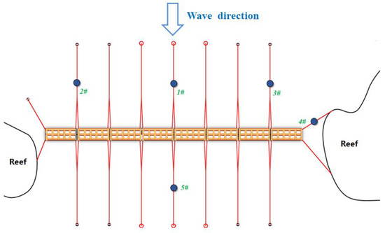As shown in Figure 33, the angle between the 4# mooring line direction and the beam wave (β = 90°) is large. Under the action of the beam waves (β = 90°), the peak mooring force of the 4# mooring line should be smaller in theory, but in fact, it is close to that of the adjacent 2# mooring line. This is because the anchorage point of a mooring line 4# is located on the reefs, and the length of the mooring line is shorter than that of mooring line 2#. The mooring radius is smaller, and the stiffness of the mooring line is larger, which leads to a larger stress on the mooring line. Therefore, in the design process of the mooring system of floating breakwaters under the influence of reefs, attention should be paid to the mooring lines at the reefs to prevent breakage caused by excessive forces.