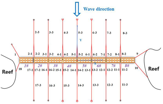 Serial number and origin diagram of mooring lines of 8 modules of breakwater models.
