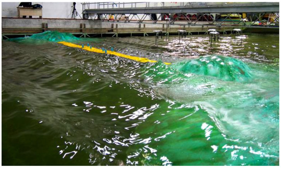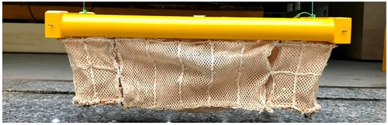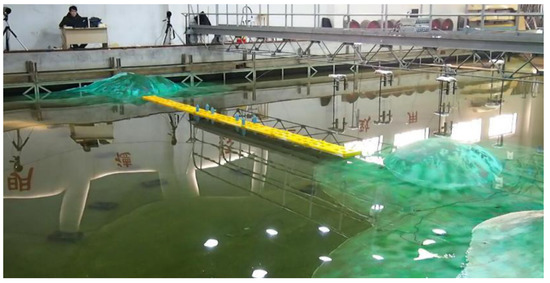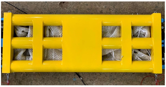 The main parameters of the floating breakwater model are listed in Table 1. The top and front views are shown in Figure 13 and Figure 14. In the model experiment, the simulation of the mesh cage ensures the consistency of the degree of density on the premise of similar material and dimension, that is, the degree of density of model netting was 0.3 kg/m3. The mesh cage model is illustrated in Figure 14.