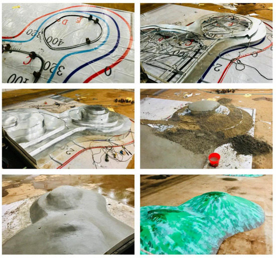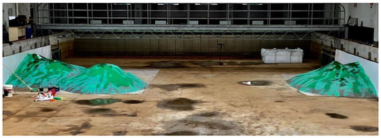 When waves propagate from deep water to shallow water, influenced by reefs, they undergo a series of complex changes, such as refraction, diffraction, reflection, and fragmentation, and the floating breakwater is often impacted by these evolving waves. To investigate the hydrodynamic performance of a floating breakwater under the influence of reefs, it is necessary to simulate the reefs in the model experiment of the floating breakwater. The reefs in the experiment were simulated according to the bathymetric map of existing reefs in the East China Sea. The construction process and final results are shown in Figure 16 and Figure 17.