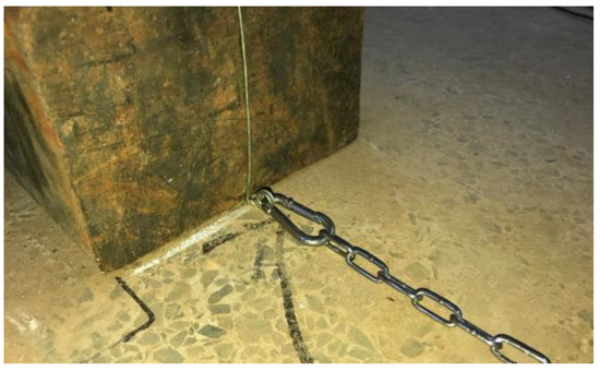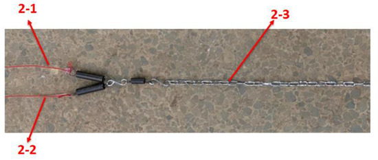The floating breakwater system was slack-moored in its equilibrium position. In this experiment, we defined the part of the mooring lines connected to the floating breakwater model as the top mooring lines, and the part of the mooring lines connected to the anchor point is considered the bottom mooring lines. The top of the four mooring lines at both ends (including mooring lines 1, 9, 10, and 18) was a polyester cable, and the bottom line was a chain. The rest of the mooring system was a Y-type mooring mode (e.g., Figure 18), with the top two mooring lines (e.g., 2-1 and 2-2) using a polyester cable, and the bottom mooring lines (e.g., 2-3) using a chain. The mooring system layout and number in the experiment are shown in Figure 10, and the mooring line-specific parameters are listed in Table 2 and Table 3. The stiffness of each mooring line was simulated by a spring, and the mooring line and anchorage point models are shown in Figure 18, Figure 19 and Figure 20. The middle water surface of modules 4# and 5# was taken as the origin of the coordinates. The x, y, and z axes were taken along the length direction of the breakwater, parallel to the wave direction, and vertically upward, respectively (as shown in Figure 10). The coordinates of the fairlead and anchorage point of the breakwater are listed in Table 4.