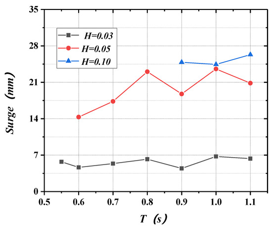 Figure 24, Figure 25, Figure 26, Figure 27, Figure 28 and Figure 29 show the changing curves of the motion responses of the floating breakwaters, including surge, sway, heave, roll, pitch, and yaw. As can be seen from the figures, as a whole, the motion responses of the floating breakwaters gradually increase with the increase in wave height and period.