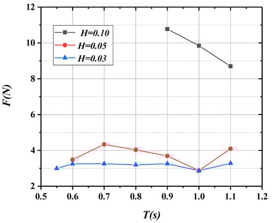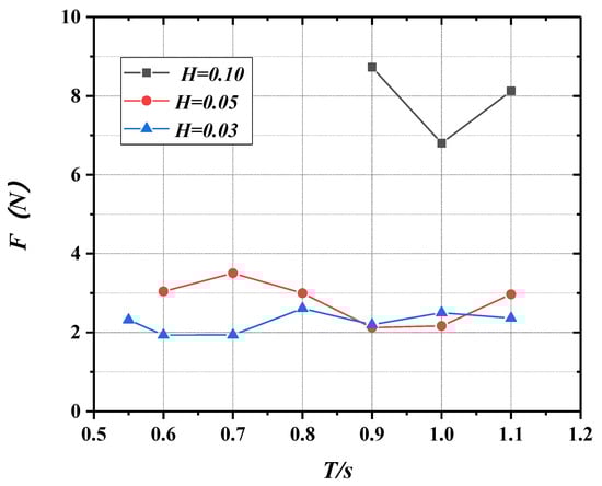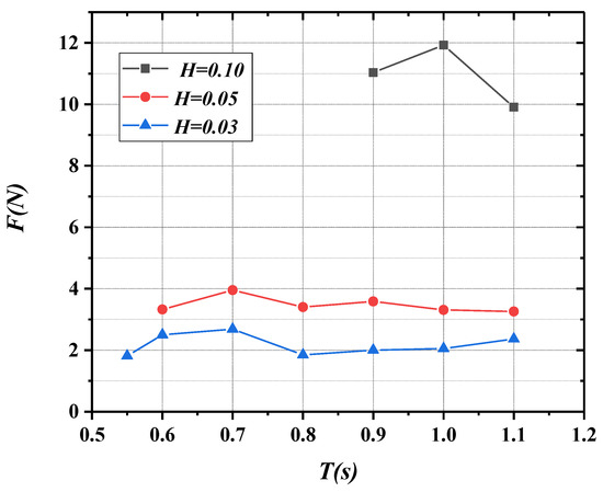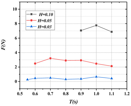 Figure 30, Figure 31, Figure 32, Figure 33 and Figure 34 reveal the changing curves of peak mooring forces with varying wave period as the incident wave height is 0.03, 0.05, and 0.10 m. As can be seen from Figure 30, Figure 31, Figure 32, Figure 33 and Figure 34, the peak mooring forces increase gradually with the increase in wave height on the whole, and the peak mooring forces have no obvious relationship with the wave period and tend to be stable overall.