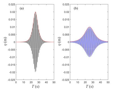 Theoretical envelope soliton of Equation (4) with ω0 = 2π rad/s; (a) Asol = 0.02 m; (b) Asol = 0.01 m.