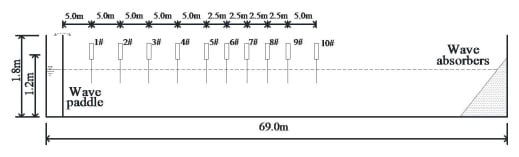 The validation of the model was made by a comparison with the experimental results [35]. The experiments were conducted in a wave flume located at the State Key Laboratory of Coastal and Offshore Engineering, Dalian University of Technology, Dalian, China. The validation was intended to show the accuracy of the model to reproduce the evolution of long-crested irregular waves. The wave flume is 69.0 m long and 2.0 m wide with a water depth of 1.2 m. The experimental setup is shown in Figure 2. The flume was equipped with a piston-type wave maker and the origin of the horizontal coordinate was located at the mean position of the wave maker. A wave absorber was installed on the opposite side to minimize wave reflections. The random wave field was characterized by the Joint North SeaWave Project (JONSWAP) spectrum with different combinations of the bandwidth and steepness. The parameters of the wave conditions are specified in Table 1. The time series of the surface elevation measured at the first probe was decomposed into a number of independent harmonics and used to generate the input boundary conditions for numerical simulations. The experiments were reproduced with the following numerical settings: total duration T = 300 s and number of discretization nodes N = 2048. Although M = 3 is accurate enough for most cases [30], in order to guarantee almost fully nonlinear interactions, realizations were simulated with M = 6 in the present study.