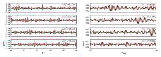 Comparisons of the surface elevations between the experimental data (black solid lines) and the numerical results (red solid lines) for Case A (left), and Case B (right).