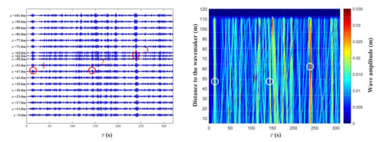 Left: Temporal evolution of the surface elevations at different locations (Case B: γ = 7.0, Hs = 0.03 m). Right: Spatiotemporal diagram of the wave envelope amplitude (Case B: γ = 7.0, Hs = 0.03 m).
