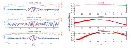 Left: Comparison between the detected soliton (blue solid line) and the theoretical envelope soliton profile (red dashed line). The black dashed line is the envelope of theoretical soliton. The green dashed line is the envelope of detected soliton. Right: Correlation coefficient between three wave groups and the theoretical solitons (red solid line) and the threshold to be successful solitons (black dashed line).