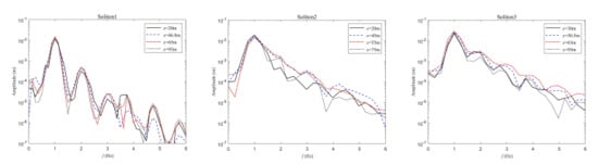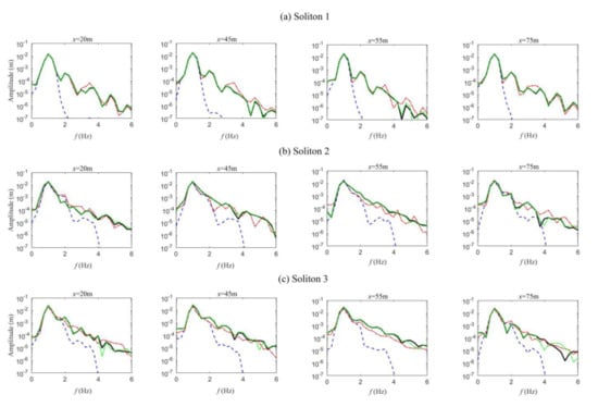 To fully understand the formation process of solitons, the local wave groups at each location were extracted. Each wave group was centered at the maximum height of the soliton, and the time interval of the wave group was two times Tsol. The wave amplitude spectra obtained by Fourier transform at different locations along the flume are presented in Figure 6 for the three solitons. It is noted that for Soliton 1, the width of the spectrum slightly decreased during the evolutionary process. However, for Soliton 2, the wave spectrum underwent a significant change. The components at the higher sides of the peak frequency gained energy, and the width of the spectrum was broadened at x = 45 m and 55 m where the solitons emerged. When the solitons disappeared, the energy of the higher components decreased, and the width of the spectrum narrowed. The spectrum had a tendency of recurring back to the original state and the energy transfer seemed to be reversible. For Soliton 3, as seen in Figure 6 (right), the results were similar: the spectrum was also widened due to the emergence of solitons; as the soliton disappeared, the spectrum returned to a narrow one.