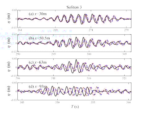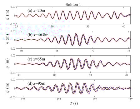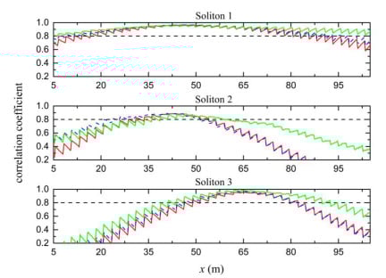 The correlation coefficient between the simulated solitons and the theoretical solitons along the flume is presented in Figure 5 (right). The black dashed lines indicate the 80% threshold. The persistence distance of the soliton is the interval above the black dashed lines, and it can be clearly identified from Figure 5 (right). There are remarkable differences between the three solitons in terms of persistence distance.