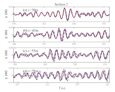 For Soliton 1, the wave group already exhibited a soliton shape from the wave maker side and remained a qualified soliton till the end of the numerical tank. The correlation coefficient grew and reached its maximum of about 0.96 at x = 46.8 m, and then decreased; the persistence distance was the whole length of the wave tank which contained about 65 times the peak wavelength. For Soliton 2, it was hard to predict whether this wave group could evolve to a soliton in prior, since at the beginning there were no similarities between the shape of this wave group and a soliton. The wave group evolved progressively to a soliton at about x = 39.0 m, and the correlation coefficient attained its maximum at about x = 46.4 m. This soliton persisted for a relative short distance (20 m) which contained about 13 times the peak wavelength. For Soliton 3, the correlation coefficient increased to a maximum, reaching as high as 0.99 at x = 63.6 m and the persistence distance was about 32 times the peak wavelength (50 m).