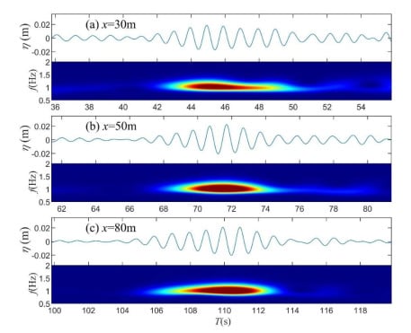 The time series and corresponding wavelet spectrum for Soliton 1 at three locations: (a) x = 30.0 m; (b) x = 50.0 m; (c) x = 80.0 m.