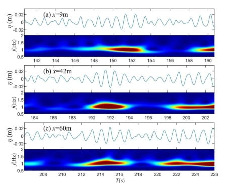 The time series and corresponding wavelet spectrum for Soliton 2 at three locations: (a) x = 9.0 m; (b) x = 42.0 m; (c) x = 60.0 m.