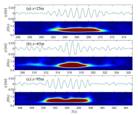 The time series and corresponding wavelet spectrum for Soliton 3 at three locations: (a) x = 25.0 m; (b) x = 65.0 m; (c) x = 95.0 m.