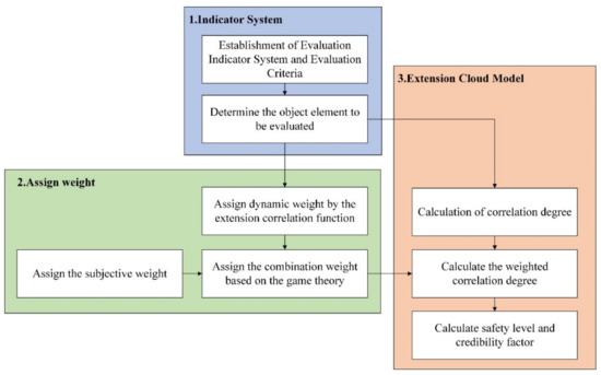 In this paper, the extension cloud model, which has the advantages of the cloud model and matter-element extension model, innovatively applies to the assessment of the emergency situation safety level after marine ship collision accidents. In this process, this paper constructs an evaluation indicator system for the emergency situation safety rating of marine collision accidents based on the ship–environment–rescue logic model, thereby ensuring the comprehensiveness of the evaluation results. According to this evaluation system, this paper uses the extension cloud model to evaluate the risk level. The entropy and super entropy in the extension cloud model can express the ambiguity and randomness in the evaluation process. This paper uses the game theory method to combine and optimize the subjective weights obtained by the analytic hierarchy process, the dynamic weights obtained from the extension correlation function, and obtain the comprehensive weights of each indicator in the emergency situation security level assessment. The model in this paper is verified through two real accident cases published by the China Maritime Safety Administration, and the results prove that the method in this paper can accurately and reasonably assess the safety posture of a ship after a collision. The model framework established in this paper is shown in Figure 1. All parts of the model are described in detail in subsequent sections of this article.