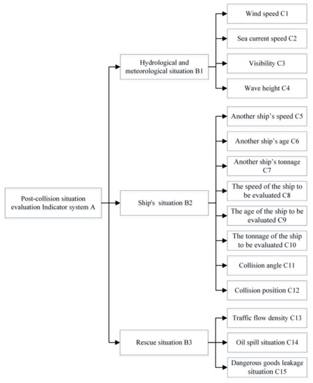 The evaluation indicator system of the situation safety after collisions at sea established in this paper is shown in Figure 3. This article uses the idea of stratification of indicators in the Analytic Hierarchy Process (AHP) and divides the indicators into three levels [28]. The top level is the evaluation indicator describing the post-collision situation safety of the ship, which is an abstract evaluation objective. The second level includes the ships situation, rescue situations, and emergency site hydrometeorological conditions. The third level provides 15 evaluation indicators, including wind speed, sea current speed, visibility, wave height, another ship’s speed, another ship’s tonnage, another ship’s age, the speed of the ship to be evaluated, the tonnage of the ship to be evaluated, the age of the ship to be evaluated, collision angle, collision position, traffic flow density, oil spill situation, and dangerous goods leakage situation.