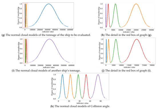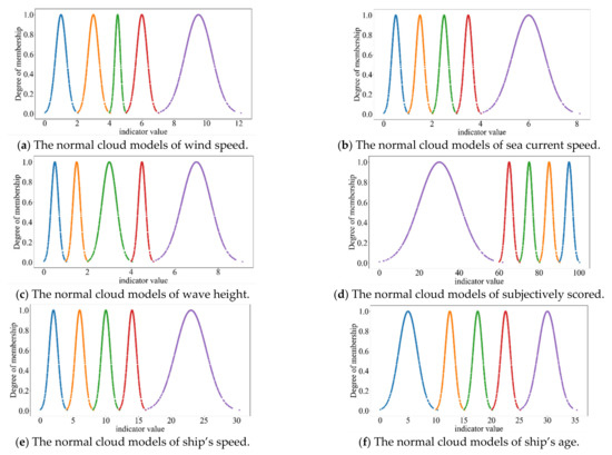 The cloud model expresses the randomness and ambiguity in objective things or human knowledge through a unified mathematical expression, reflecting the universal law of objective phenomena with randomness and ambiguity [21,22]. The cloud model mainly includes the normal cloud model, triangular cloud model, and symmetric cloud model. The normal cloud model is the most important and widely used. The general applicability of the normal cloud model has been proven [23,24,25]. The normal cloud model embodies its numerical characteristics by the expected value, entropy, and hyper-entropy. The expected value is the centre of the cloud of the cloud diagram, and it is also the point which best represents the qualitative concept of things. The situational safety after collisions at sea is based on this value. The entropydescribes the uncertainty of things, which is determined by the randomness and ambiguity of things. It can not only reflect the randomness of the situational safety evaluation indicator value, it can also reflect the fuzziness of the data of the object to be evaluated in the situational safety level; the hyper-entropy is the uncertainty measure of the entropy , it represents the degree of correlation between randomness and ambiguity of various factors that affect situational security. To weaken the randomness and fuzziness in the process of the situation security evaluation, the expected value, entropy , and hyper-entropy are used to construct the situational security level boundary and the cloud correlation function.