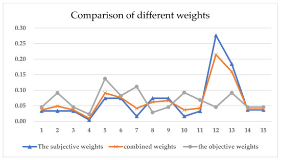 (1) Let the basic weight vector set be ; n is the number of indicators and L is the number of methods to determine the weight, which is 2 in this paper. Let the linear combination weight coefficient be . Any linear combination of these vectors is shown as Equation (15):