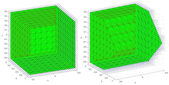 Step 6. Loop over the whole CFD domain, , and find all neighboring-cell pairs , and whose status pair , and . Pairs of this kind indicate fluid-structure intersecting edges. The intersecting point on the embedded wetted surface, , is then located. The outcome of this step is illustrated in Figure 6. The red points are the intersecting points computed in this step.