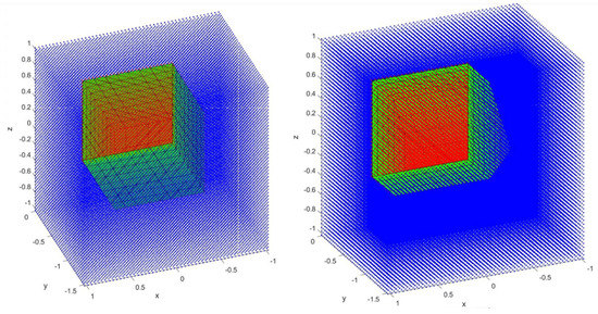 Step 3. Denote the fluid mesh as and the embedded wetted mesh as . in these configurations is a Cartesian structured mesh, but it could be any type, structured or unstructured. For each cell center , an axis-aligned bounding box is constructed, connecting its neighboring cell centers as vertices. Also, for each triangle of the embedded wetted mesh, an axis-aligned bounding box is constructed which is the smallest box that can enclose the triangle.