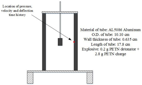 Case 1 investigates an internal explosion inside a water-filled Aluminum tube. This experiment was performed by Sandusky et al. [33,34]. A 3 g PETN charge is placed at the center of the tube that is made of Aluminum 5086. A thin plastic sheet is used to seal the bottom of the tube. The top of the tube is left open. A pressure gauge is installed at the inner center of the tube wall to measure the pressure-time history [15,35,36]. The arrangement of this experiment is illustrated in Figure 8. Time histories of fluid pressure, wall velocity and deflection are sampled at the inner center of the wall as shown in Figure 8.