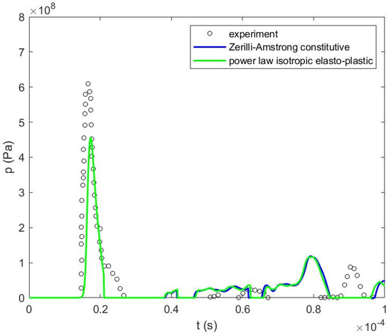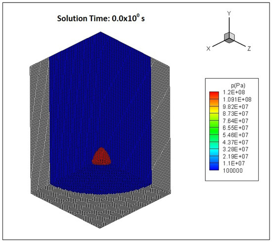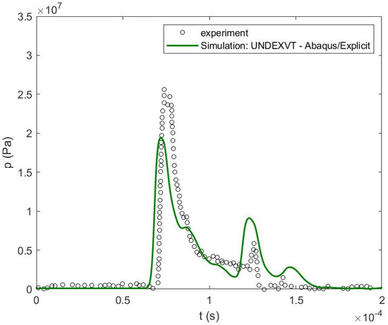 The actual charge was RP-503, which is a mixture of 454 mg RDX and 167 mg PETN [38]. RDX parameter values for the Johns–Wilkins–Lee equation of state are unavailable in any reliable source such as handbooks published by LLNL national laboratory [41]. An alternative method to estimate these parameters is to use TNT equivalence [42]. The TNT equivalent of this total charge is 1003.62 mg TNT and this mass was used in the simulation with TNT parameters for the Johns-Wilkins-Lee equation of state. It is possible that the use of different parameters caused the radius of the explosive gaseous bubble, pressure and plate deflection to be underpredicted.