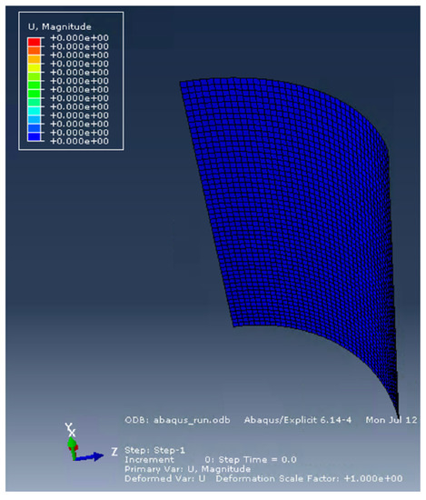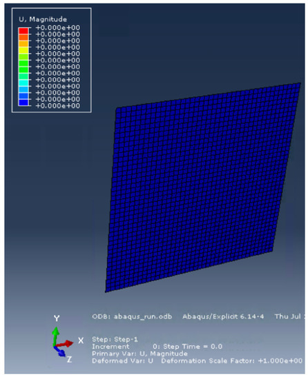 The E-glass/epoxy composite material studied in this case is Cyply 1002, a product manufactured by Cytec Engineering Materials [38,39]. The material is a cross-ply construction with three alternating plies of 0°, 90° and 0° and is modeled in Abaqus/Explicit as shown in Figure 29. The thickness of the plate is 0.762 mm with each ply’s thickness equal to 0.254 mm. Material constants and other details can be found in [38,39,40]. The RP-503 charge is located 50.8 mm from the center of the outer surface of the plate. A tourmaline pressure sensor is placed in the tank whose horizontal stand-off distance from the charge is 100 mm with unknown bearing. The computational model of this experiment is set up as shown in Figure 30. The plate is embedded in the CFD domain. The domain on the back side of the embedded structure is not modeled as part of the fluid. This model represents a subdomain of the whole experimental tank as explained in Case 2 [38]. The configuration is symmetric about the y-axis and therefore a one-quarter domain is built for computational efficiency. All boundaries except for the symmetry boundaries are treated using the non-reflecting boundary conditions (NRBC).