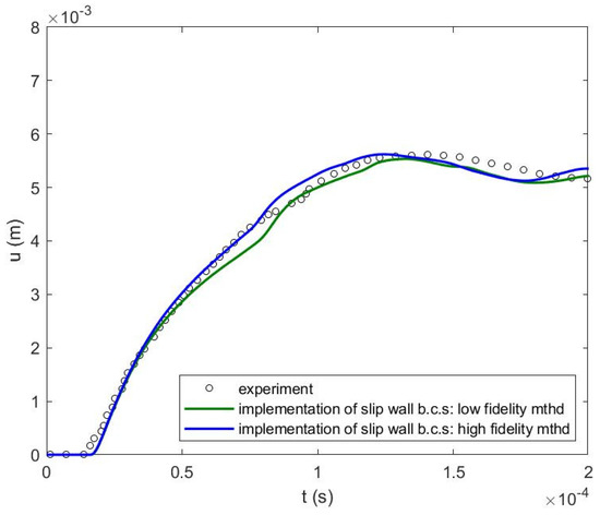 The simulated deformation and velocity of the inner center of the wall are plotted in Figure 14 and Figure 15, respectively, using both approaches of implementing the fluid-structure slip-wall boundary condition, and are compared with the experiment. Fluid pressure at the same location are plotted in Figure 16 showing results for experiment and simulations using both approaches of slip-wall boundary implementation.