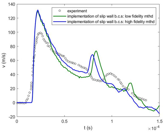 Velocity of the inner center of the wall (experiment and simulations using both approaches of wall boundary implementation) [34].