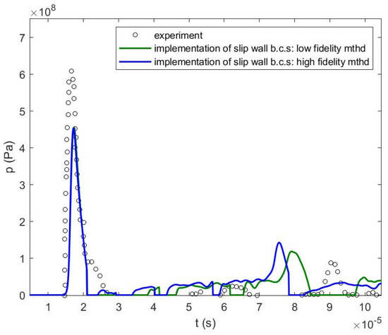 Fluid pressure at the inner center of the wall (experiment and simulations using both approaches of wall boundary implementation) [15,34].
