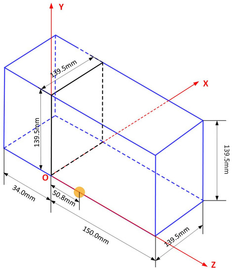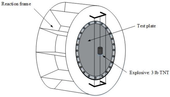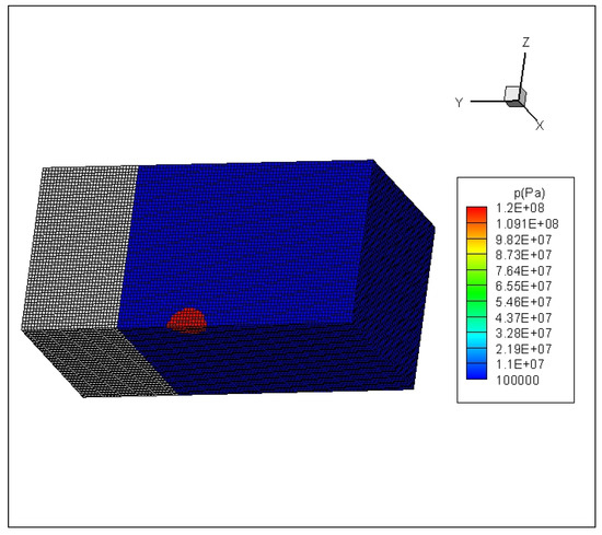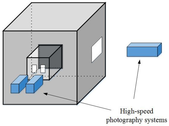 Case 3 is an UNDEX scenario that occurs near a structure made of composite materials. This case can be validated by experimental results. This experiment [38], explodes a RP-503 charge consisting of 454 mg RDG and 167 mg PETN near an air-backed E-glass/Epoxy composite plate mounted on a frame in a blast water tank. The dimension of the tank is with a wall thickness of 6.35 mm. A rectangular tunnel is mounted to the inner center of one wall and its dimensions are mm. This tunnel provides a rigid frame to support the plate for testing and it extends 394 mm into the tank filled by water. Dimensions of the unsupported part of the plate are . The transient response of the plate is measured using a high-speed photography system with digital image correlation (DIC) which is installed on the back side of the plate outside the tank window. A third high-speed camera is installed on the side to monitor the detonation of the explosive and other responses of the fluid field. A sketch of the testing framework is illustrated in Figure 28 [38].